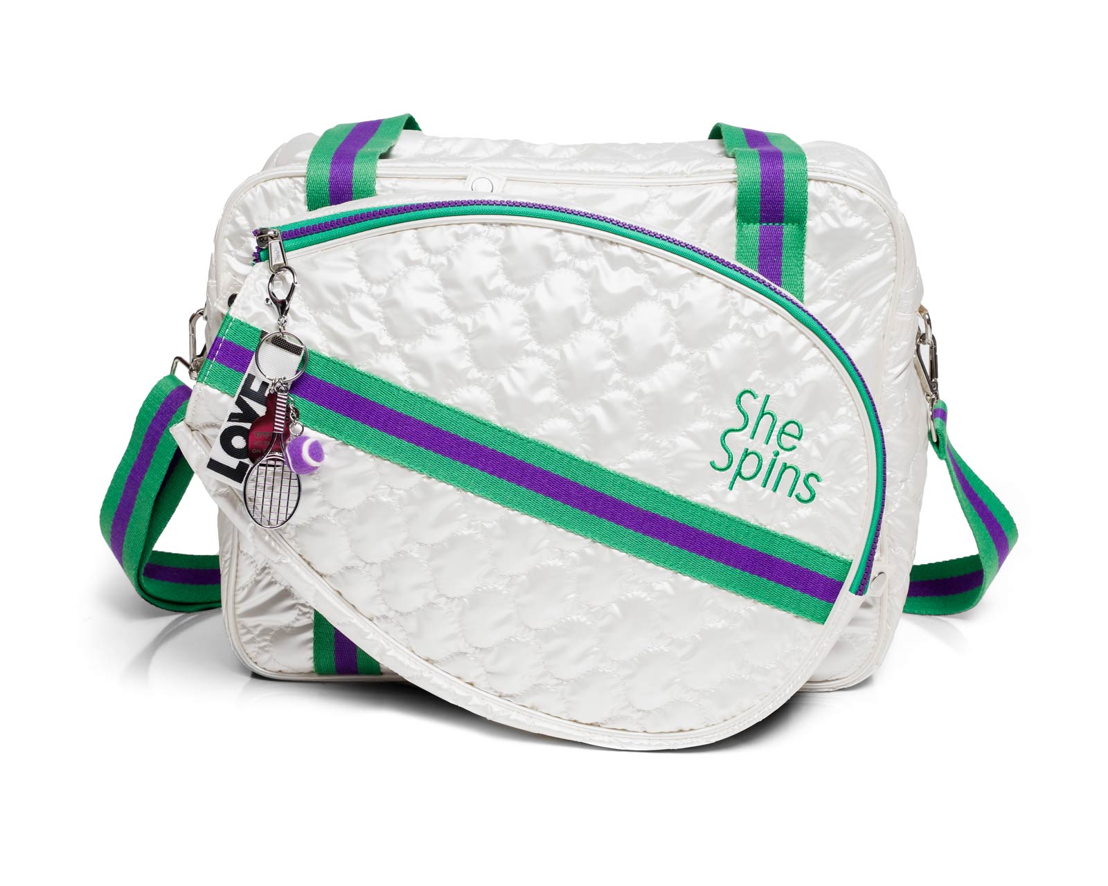 The fashionable bag comes with a matching racket sleeve that can hold up to two rackets. The racket holder can be clipped to the bag or carried on its own using the detachable crossbody strap. If you want to carry your racket solo, don’t worry, the sleeve has pockets for your phone, keys, etc.